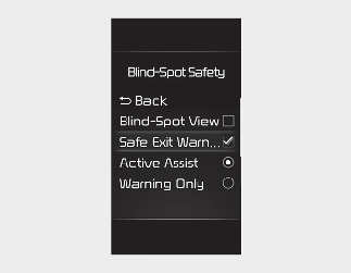 With the ENGINE START/STOP button in the ON position, and select 'User Settings (LCD display) or Setup → Vehicle (Infotainment System screen) → Driver Assistance → Blind-Spot Safety → Safe Exit Warning' to turn on Safe Exit Warning and deselect to turn off.