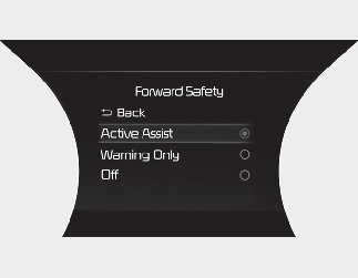 • If ‘Active Assist’ is selected, the function will warn the driver with a warning message, an audible warning depending on the collision risk levels.