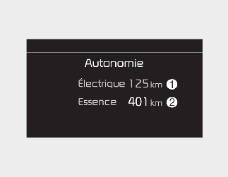 L'autonomie est la distance estimée que le véhicule peut parcourir avec le reste de la batterie haute tension (hybride) (1, électrique) et le carburant restant dans le réservoir de carburant (2, essence).