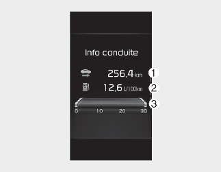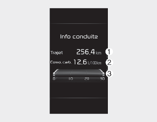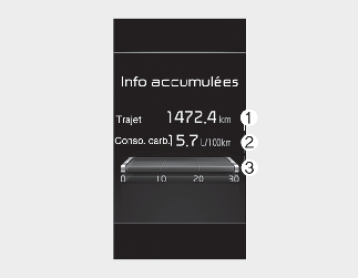 Cet écran indique la distance cumulée du trajet (1), la consommation moyenne de carburant (2) et la consommation instantanée de carburant (3).