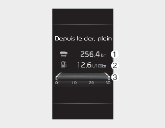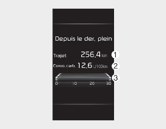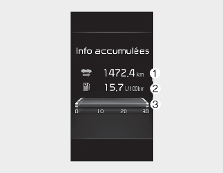Cet écran indique la distance cumulée du trajet (1), la consommation moyenne de carburant (2) et la consommation instantanée de carburant (3) après le plein.