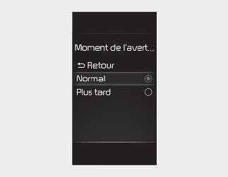 Sélectionnez « Late (tard) » comme délai d’avertissement lorsque la circulation est fluide et lente.