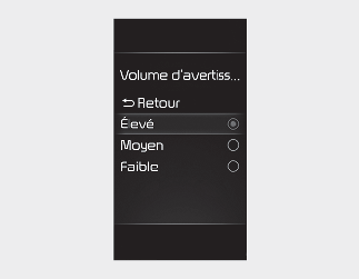 Si vous changez le volume sonore d’avertissement, le volume d’avertissement des autres fonctions d'assistance au conducteur peut changer. Réglez le volume d'avertissement après avoir vous être suffisamment familiarisé avec l'avertissement.