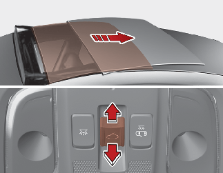 Poussez le contacteur du toit ouvrant vers l'arrière jusqu'à la première position d'arrêt et la vitre du toit ouvrant s'ouvre. Toutefois, si le pare-soleil électrique est fermé, celui-ci s'ouvrira d'abord. Poussez le contacteur du toit ouvrant vers l'avant jusqu'à la première position d'arrêt et la vitre du toit ouvrant se ferme. Cependant, si la vitre de toit ouvrant est fermée, le pare-soleil électrique se ferme.