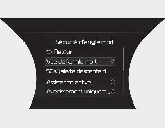 Avec le bouton de démarrage/arrêt du moteur en position ON (marche), sélectionnez ou désélectionnez « Réglages utilisateur (écran LCD) ou Réglages → Véhicule (écran du Système d’infodivertissement) → Assistance au conducteur → Sécurité d’angle mort » pour définir l’utilisation ou non de chaque fonction.