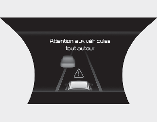 Dans la situation suivante, le message ‘Watch for surrounding vehicles (Attention aux véhicules alentours)’ apparaîtra dans le combiné d’instruments et un signal sonore retentira pour avertir le conducteur des conditions de circulation devant lui.