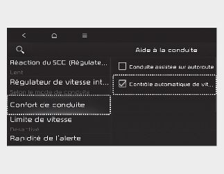 Avec le bouton de démarrage/arrêt du moteur en position ON (marche), sélectionnez ou désélectionnez 'Assistance au conducteur → Confort de conduite » depuis les « Réglages utilisateur (écran LCD) ou Réglages → Véhicule (écran du système d’infodivertissement) pour définir l’utilisation ou non de chaque fonction.