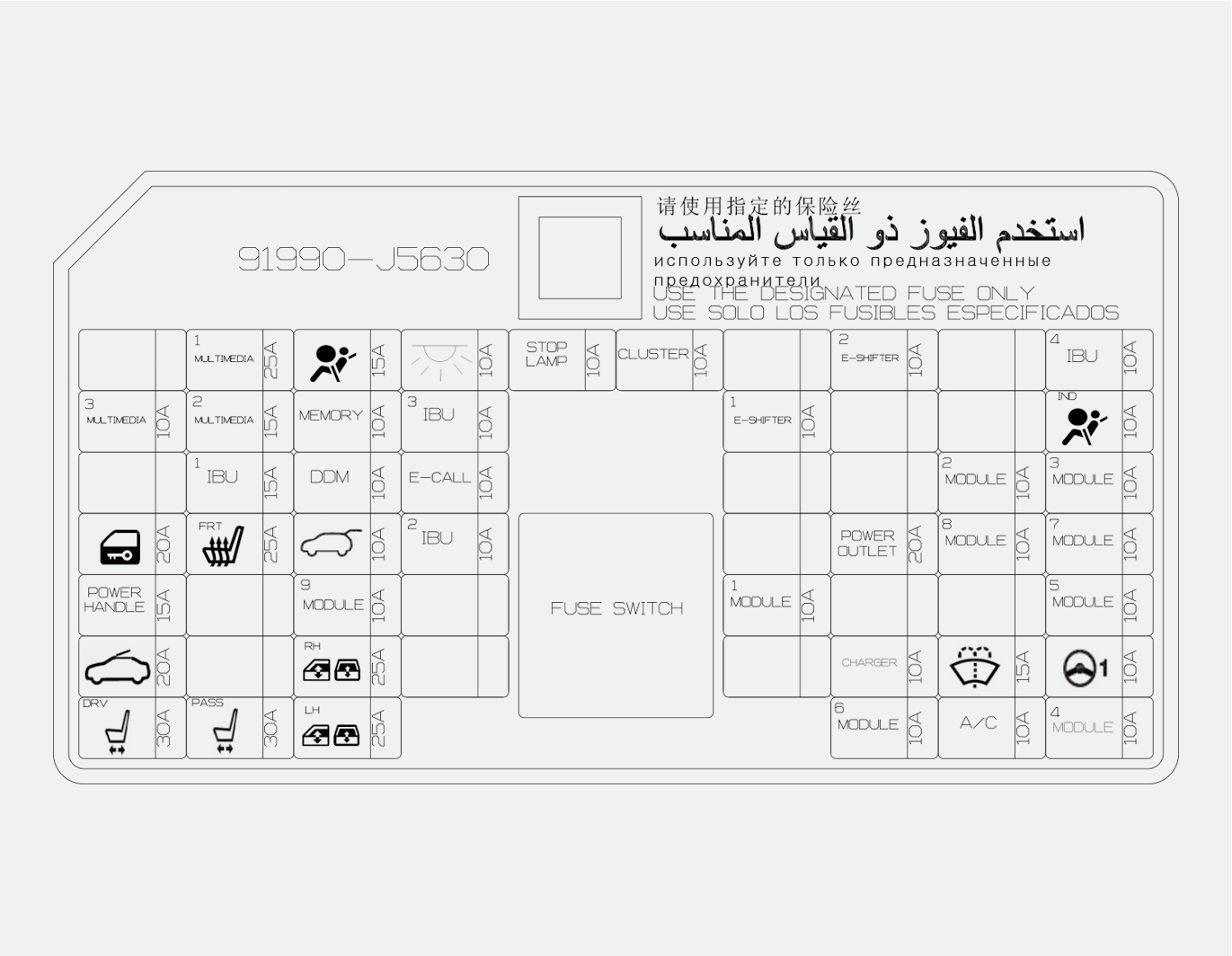 IBU, Écran de visualisation périphérique, Audio, AMP (Amplificateur), Module E-CAll MTS (Mozen Telematics System), Convertisseur CC-CC bas (Audio/AMP (Amplificateur)), Levier sélecteur de boîte automatique (SBW (changement de rapport par fil)), Bloc de jonction de compartiment moteur (Relais de prise de courant) |