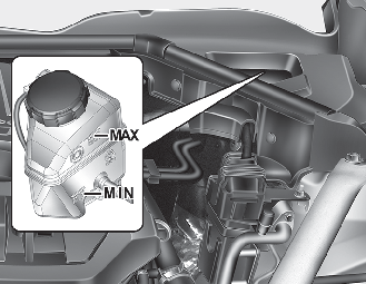 Vérifiez périodiquement que le niveau de liquide dans le réservoir de liquide de frein se situe entre MIN et MAX. Le niveau baisse à mesure que le véhicule roule. C'est un comportement normal dû à l'usure des garnitures de frein.