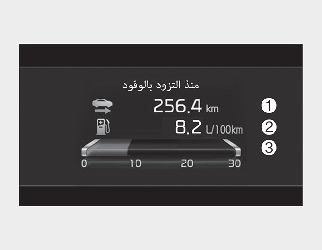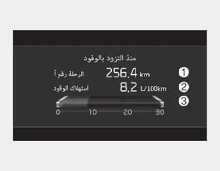 تعرض هذه الشاشة مسافة الرحلة المتراكمة (1) متوسط كفاءة الوقود (2) وتوفير الوقود الفوري (3) بعد التزود بالوقود.
