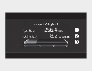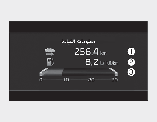 تعرض هذه الشاشة معلومات مسافة الرحلة (1)، متوسط كفاءة الوقود (2)، وتوفير الوقود الفوري (3) والبيانات مرة واحدة كل دورة إشعال.