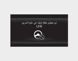 إذا استمر السائق في عدم وضع يديه على عجلة القيادة بعد صدور تحذير رفع اليدين، ستظهر رسالة التحذير "Lane Following Assist (LFA) canceled (تم إلغاء نظام المساعدة على الالتزام بالحارة المرورية)" وسيتم إلغاء نظام المساعدة على الالتزام بالحارة المرورية تلقائيًا.