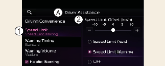 Com o veículo ligado, se selecionar Driver assistance (Assistência ao condutor) → Speed limit (Limite de velocidade) → Speed limit offset (Desvio do limite de velocidade), o desvio do limite de velocidade pode ser alterado. O Speed Limit Warning (Aviso de limite de velocidade) e o Speed Limit Assist (Assistência ao limite de velocidade) funcionam aplicando o desvio do limite de velocidade definido ao limite de velocidade detetado.