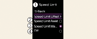 A função Speed Limit Assist (Assistência ao limite de velocidade) funciona com base na configuração da compensação adicionada ao limite de velocidade. Se pretender alterar a velocidade definida com base no limite de velocidade, defina o desvio para 0.