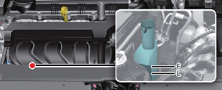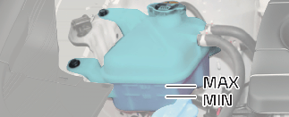 The coolant level should be filled between MAX and MIN (F and L) marks on the side of the coolant reservoir when the engine is cool.