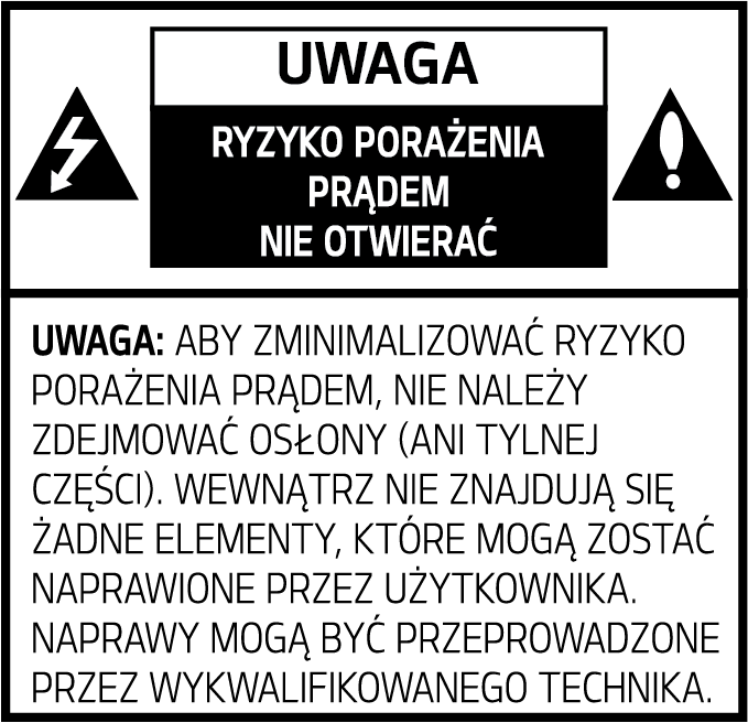Symbol błyskawicy wpisanej w trójkąt równoramienny ostrzega o niebezpiecznym, niezaizolowanym napięciu obecnym w urządzeniu, o wartości, która może narazić użytkownika na ryzyko porażenia prądem elektrycznym.