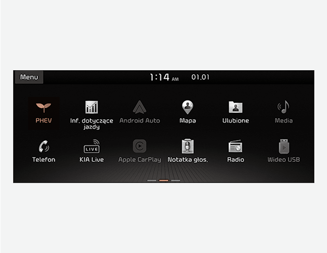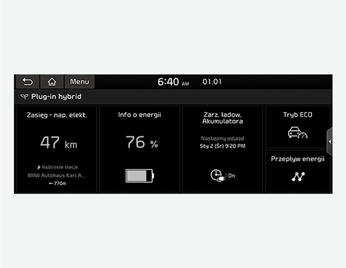Menu trybu hybrydowego plug-in składa się z pięciu części: [EV range] (Zasięg EV), [Energy information] (Informacje o zużyciu energii), [Charge management] (Sterowanie ładowaniem), [ECO driving] (Jazda w trybie ECO), [Energy flow] (Przepływ energii).
