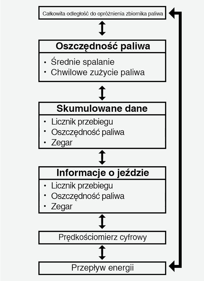 Zakres wskazań zużycia paliwa: od 0,0 do 30 km/l, l/100 km lub od 0,0 do 50,0 MPG