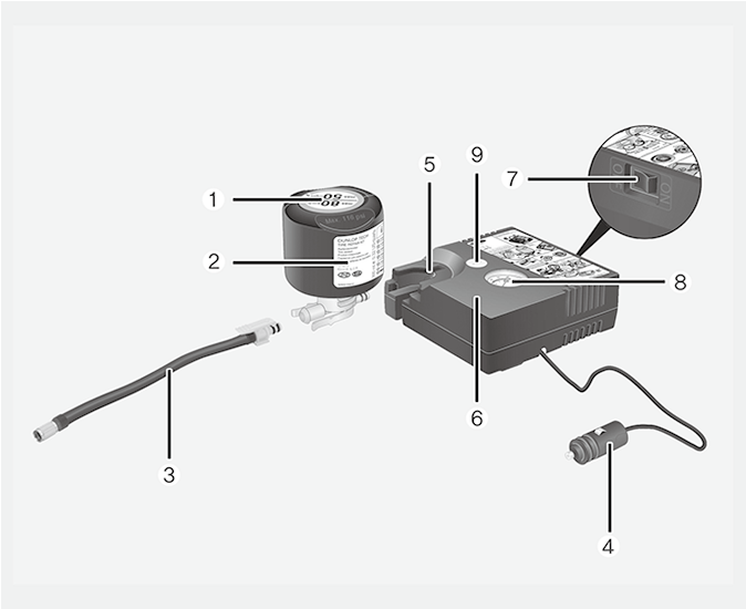 Home > What to do in an emergency > If you have a flat tyre (with tyre mobility kit) > Components of the Tyre Mobility Kit (TMK)