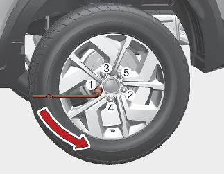 Loosen the wheel lug nuts counterclockwise one turn each, but do not remove any nut until the tyre has been raised off the ground.