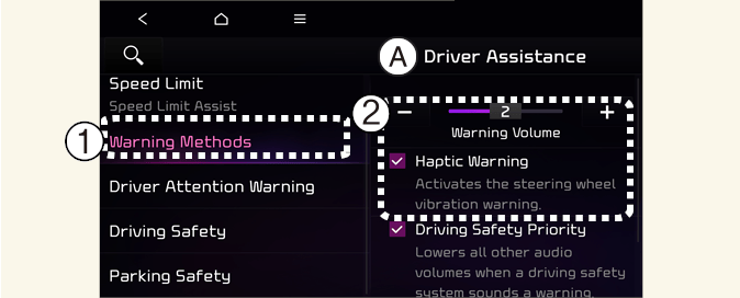 Haptiskais brīdinājums: Izvēlieties Lietotāja iestatījumi → Palīdzība vadītājam → Haptiskais brīdinājums instrumentu panelī vai izvēlieties Iestatījumi → Transportlīdzeklis → Palīdzība vadītājam → Brīdinājuma metodes → Haptiskais brīdinājums informācijas un izklaides sistēmā, un noregulējiet haptiskais brīdinājums. (ja ir aprīkojumā)