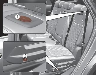 Nacisnąć przełącznik (1) w górnej części siedzenia drugiego rzędu lub przełącznik (2) w dolnej części siedzenia drugiego rzędu, aby odblokować.