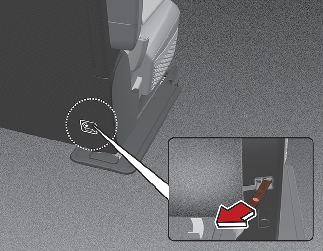 Można również odblokować siedzenie w 2. rzędzie, pociągając za pasek (jeżeli jest w wyposażeniu) umieszczony pod oparciem siedzenia w 2. rzędzie. Jeśli pojazd jest wyposażony w pasek pod oparciem siedzenia w 2. rzędzie, we wnętrzu jest zamocowana etykieta wskazująca położenie paska.