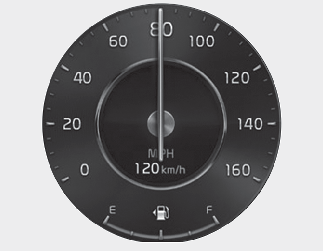 Prędkościomierz wskazuje prędkość pojazdu i jest skalibrowany w kilometrach na godzinę (km/h) i milach na godzinę (mph).