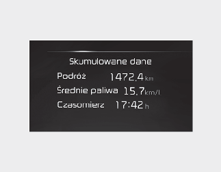 Na tym ekranie są wyświetlane odległość podróży, średnie zużycie paliwa i całkowity czas jazdy dla każdego cyklu zapłonu.