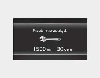Jeżeli pozostały dystans lub czas wyniesie odpowiednio 1500 km lub 30 dni, po każdym włączeniu zapłonu przełącznikiem zapłonu lub przyciskiem ENGINE START/STOP (włączenie/wyłączenie silnika) na kilka sekund pojawia się informacja „Service in” (Przegląd za).