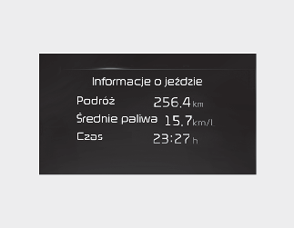 Na tym ekranie są wyświetlane odległość podróży, średnie zużycie paliwa i czas jazdy.