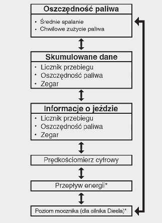 Zakres wskazań zużycia paliwa: od 0,0 do 30 km/l, l/100 km lub od 0,0 do 50,0 MPG