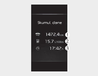 Na tym ekranie są wyświetlane odległość podróży (1), średnie spalanie (2) i całkowity czas jazdy (3) dla każdego cyklu zapłonu.
