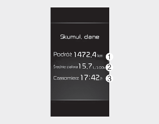 Na tym ekranie wyświetlono rosnącą odległość podróży (1), średnie spalanie (2) i całkowity czas jazdy (3).