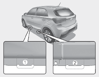 7. Umieścić podnośnik w przednim (1) lub tylnym (2) miejscu podnoszenia znajdującym się najbliżej wymienianego koła. Umieścić podnośnik w oznaczonym miejscu pod ramą pojazdu. Miejsca podnoszenia to przyspawane do ramy płytki z wycięciami i wypustem, które służą do właściwego dopasowania podnośnika.