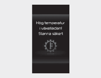 När växellådan är överhettad aktiveras skyddsläget och växelpositionsindikatorn på klustret blinkar med en signal. I det här skedet visas varningsmeddelandet, "Transmission temp. is high! Stop safely” (Temperaturen i växellådan är hög! Stanna på en säker plats) på LCD-skärmen och körningen kan kännas ryckig.