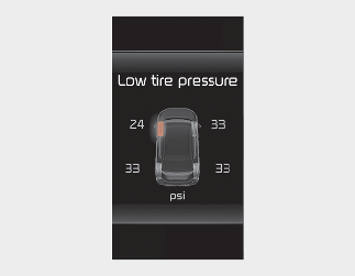 כשמחווני האזהרה של מערכת ניטור לחץ הצמיגים נדלקים ומוצגת הודעת אזהרה בצג ה-LCD שבלוח המחוונים, פירוש הדבר שלחץ האוויר בצמיג אחד או יותר נמוך באופן משמעותי.