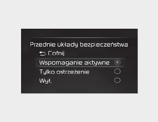 Po wybraniu opcji „Tylko ostrzeżenie” funkcja będzie ostrzegać kierowcę za pośrednictwem komunikatu ostrzegawczego, sygnału dźwiękowego i drgań kierownicy (jeśli stanowi część wyposażenia) w zależności od poziomu ryzyka kolizji. Wspomaganie hamowania będzie wyłączone.