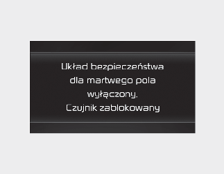 Gdy system wykrywania ryzyka kolizji w martwym polu działa nieprawidłowo, w zestawie wskaźników pojawia się komunikat ostrzegawczy „Check Blind-Spot Safety system” (Sprawdź system monitorowania martwego pola) i funkcja zostaje automatycznie wyłączona lub działa w ograniczonym zakresie. Zaleca się przegląd pojazdu u autoryzowanego dealera/partnera serwisowego marki Kia.