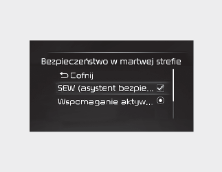 Po włączeniu zapłonu przyciskiem ENGINE START/STOP wybrać opcję „Wspomaganie kierowcy → Monitorowanie martwego pola → Asystent bezpiecznego wysiadania” z menu ustawień, aby włączyć Asystenta Bezpiecznego Wysiadania i odznacz, aby wyłączyć funkcję.