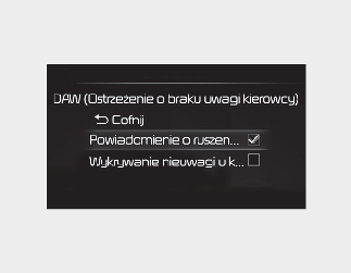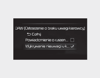 Po włączeniu zapłonu przyciskiem ENGINE START/STOP (włączenie/wyłączenie silnika) zaznaczyć lub usunąć zaznaczenie opcji „Driver Assistance (Wspomaganie kierowcy) → Driver Attention Warning (Powiadamianie o zmęczeniu kierowcy)” w menu ustawień, aby wybrać funkcje, które mają działać.