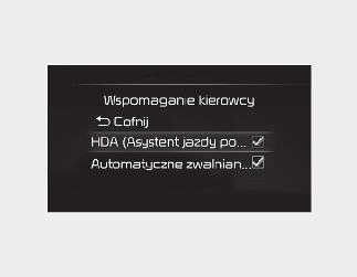 Po włączeniu zapłonu przyciskiem ENGINE START/STOP (włączenie/wyłączenie silnika) wybrać „Driver Assistance (Wspomaganie kierowcy) → Driving Assist (Wspomaganie jazdy) → Highway Auto Speed Change (Automatyczna zmiana prędkości na autostradzie)” w menu ustawień, aby włączyć inteligentny tempomat wykorzystujący system nawigacji. Usunięcie zaznaczenia tej opcji spowoduje wyłączenie funkcji.