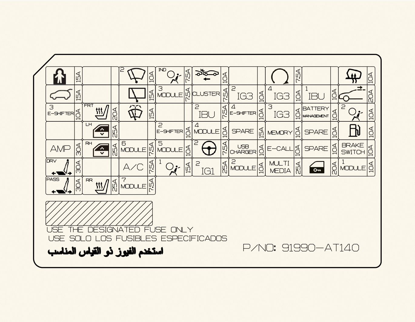 BLOQUE DE EMPALMES ICU (FUSIBLE - MODULE2, USB CHARGER, A/BAG1, IBU2, MDPS2, CLUSTER, MODULE3, A/BAG IND, MODULE4, MODULE5, E-SHIFTER2, FCA, ING1 2) |
