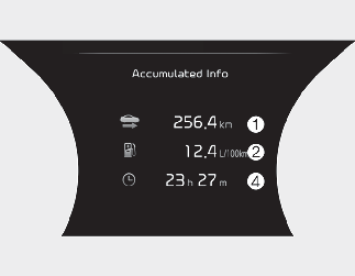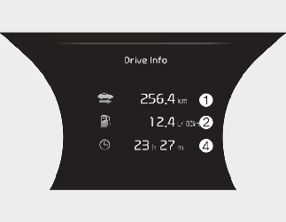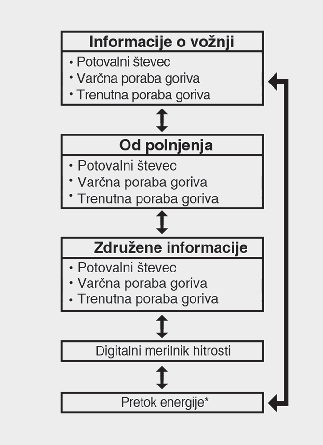 Ta zaslon prikazuje razdaljo potovanja (1), povprečno učinkovitost goriva (2) in informacije o trenutni varčnosti porabe goriva (3) in celoten čas vožnje (4) glede na en cikel vžiga.
