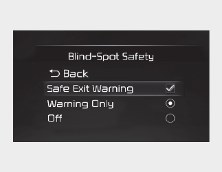 S ključavnico za vžig ali gumbom ENGINE START/STOP (Zagon/ustavitev motorja) postavite v položaj »ON« (Vklop) izklopite v meniju »User Settings« (Uporabniške nastavitve) na zaslonu LCD ali Nastavitve → Vozilo (zaslon Infotainment sistema) → Pomoč voznika → Varnost pri mrtvem kotu → Opozorilo pri varnem izhodu (SEW), da vklopite opozorilo o varnem izhodu in počistite polje, da izklopite funkcijo.