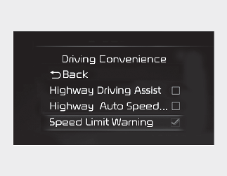 Ko sta stikalo za vžig ali gumb ENGINE START/STOP (Zagon/ustavitev motorja) v položaju »ON« (Vklop), izberite »User Settings« (Uporabniške nastavitve) → »Driver Assistance« (Pomoč vozniku) → »Driver Convenience« (Udobje voznika) na LCD zaslonu ali v sistemu, da označite, ali želite uporabljati funkcijo.