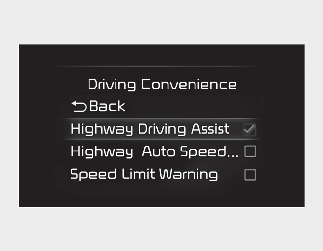 Ko sta stikalo za vžig ali gumb ENGINE START/STOP (Zagon/ustavitev motorja) v položaju »ON« (Vklop), izberite »User Settings« (Uporabniške nastavitve) → »Driver Assistance« (Pomoč vozniku) → »Driving Convenience« (Udobje pri vožnji) na LCD zaslonu ali v sistemu, da označite, ali želite uporabljati funkcijo.