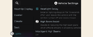 A jármű ON állásában válassza a Beállítások → Jármű → Világítás → HBA (Távolsági fényszóró asszisztens) elemet a Távolsági fényszóró asszisztens funkció bekapcsolásához.