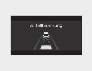 Um den Fahrer bei einer unterstützten Notbremsung zu warnen, erscheint die Warnmeldung „Emergency Braking“ (Notbremsung) auf dem Kombiinstrument, es wird ein Warnton ausgegeben und das Lenkrad vibriert.