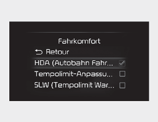 Wählen Sie, wenn der Start-/Stopp-Knopf in Position On steht, im Einstellungsmenü auf dem LCD-Display oder Infotainmentsystem die Option „Benutzereinstellungen → Fahrerassistenz → Komfort beim Fahren“ aus oder deaktivieren Sie diese, um festzulegen, welche Funktionen verwendet werden sollen.